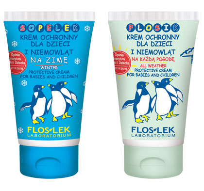 Niemowlęta powyżej 1 miesiąca życia można posmarować kremem pielęgnacyjno-ochronnym z linii For mum for baby marki Floslek. Zawiera on witaminę E, niezbędną dla delikatnej ochrony naskórka niemowlaka oraz Pantenol łagodzący podrażnienia. Krem posiada łatwą do rozsmarowania konsystencję i przyjemny zapach. Dla starszych dzieci, powyżej 6 miesiąca życia, idealnym rozwiązaniem jest krem Sopelek, marki Floslek, który nie tylko chroni przed wiatrem, mroźnym powietrzem, wilgocią, ale także przed promieniowaniem UV.